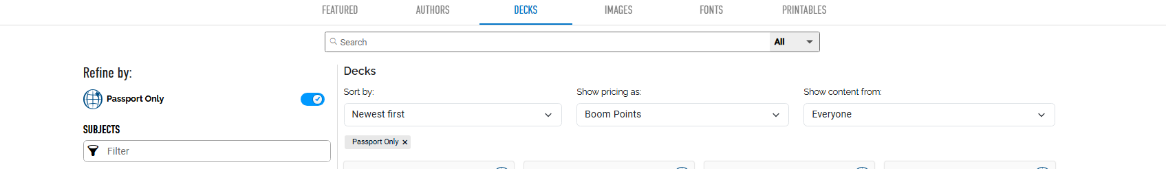 To access those resources, log in to your Boom account, navigate to the Store tab, then click the Decks tab, and on the left, ensure the Category is set to Passport Only (see below). You can search by keywords and filter by subjects and grades.